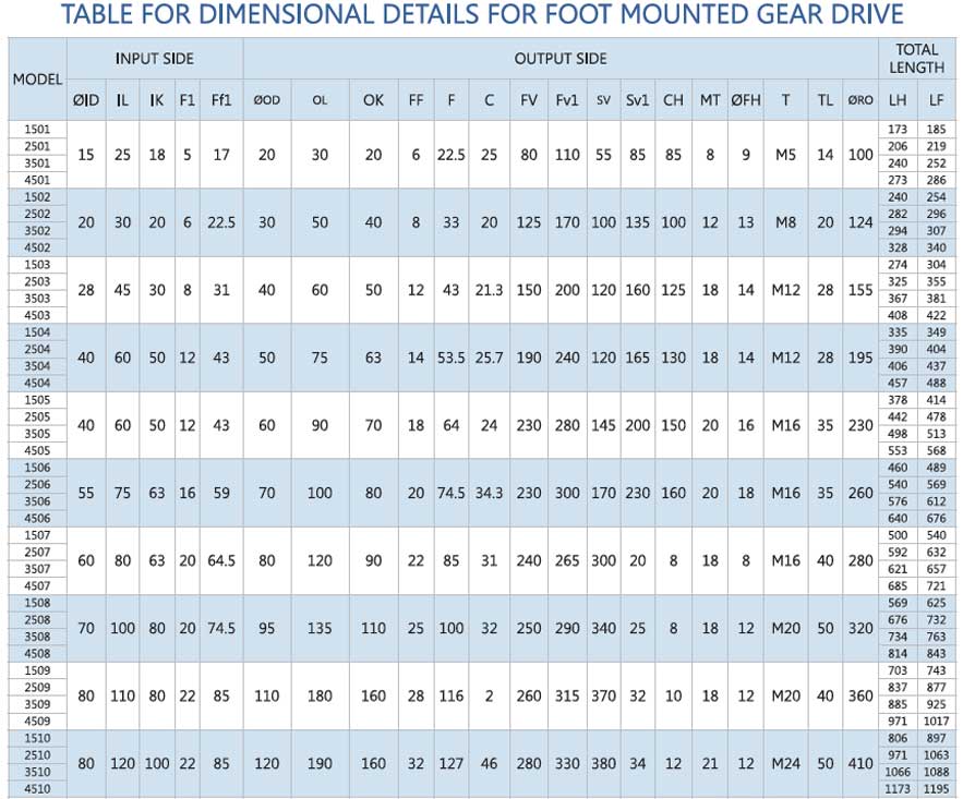 Dimensional details for foot mounted gear drive