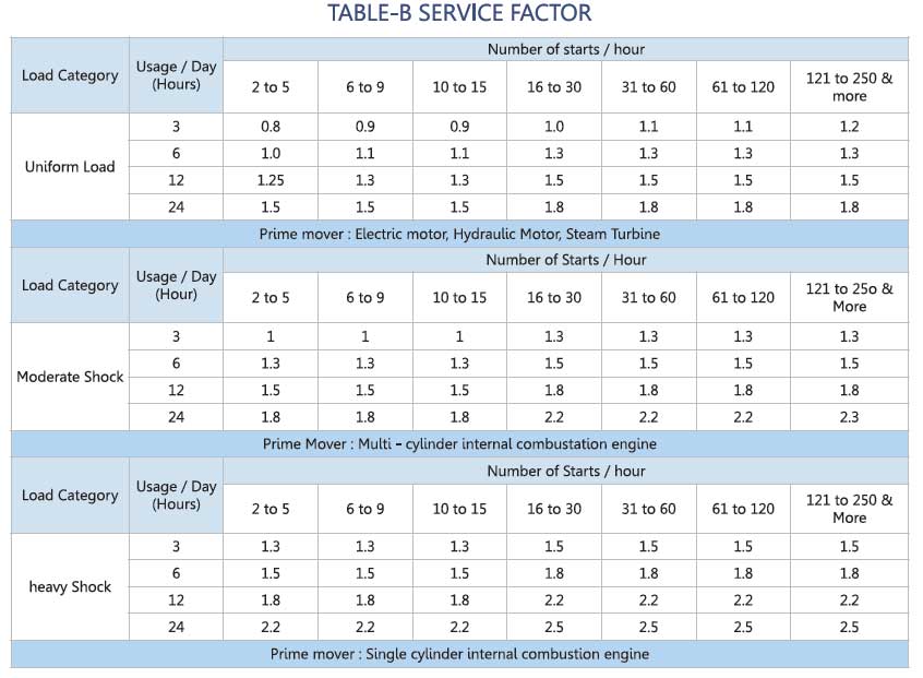 Itgives general guideline to design engineer to slect gear drive properly according to severity of application. Refer Table no : B for operation specific service factor selection table which covers industry specific application to prevent designer from selecting under rated gear drive. It also act cross checking for analayzing previsouly calculated service factor.