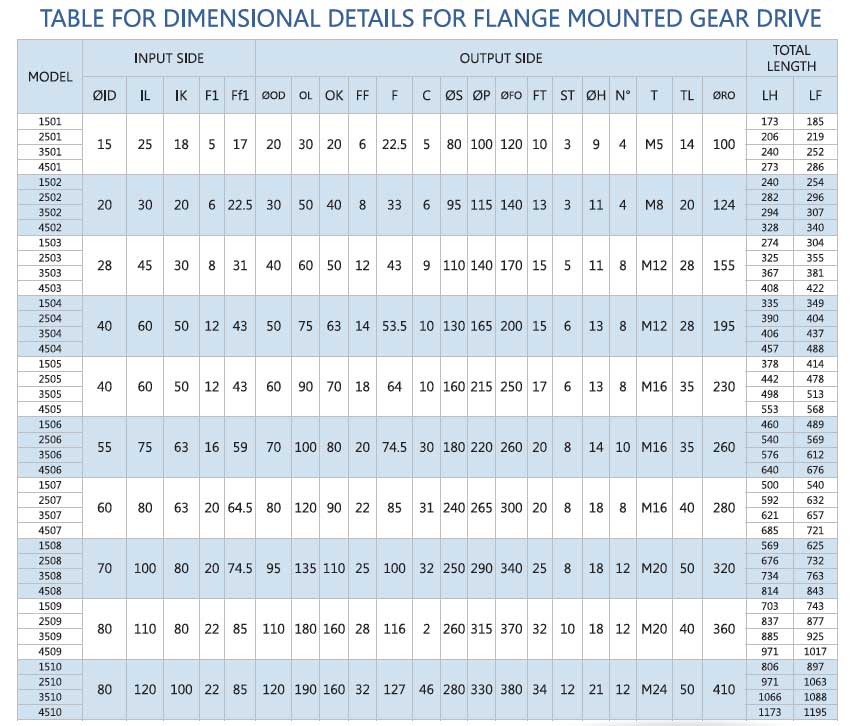 Dimensional details for flange mounted gear drive